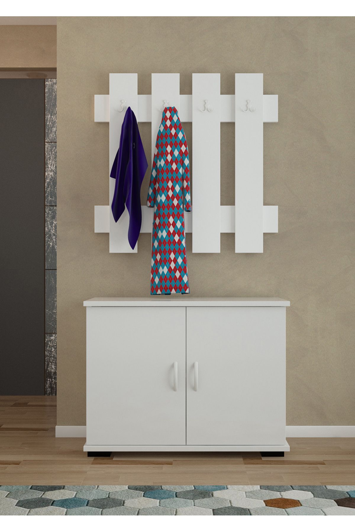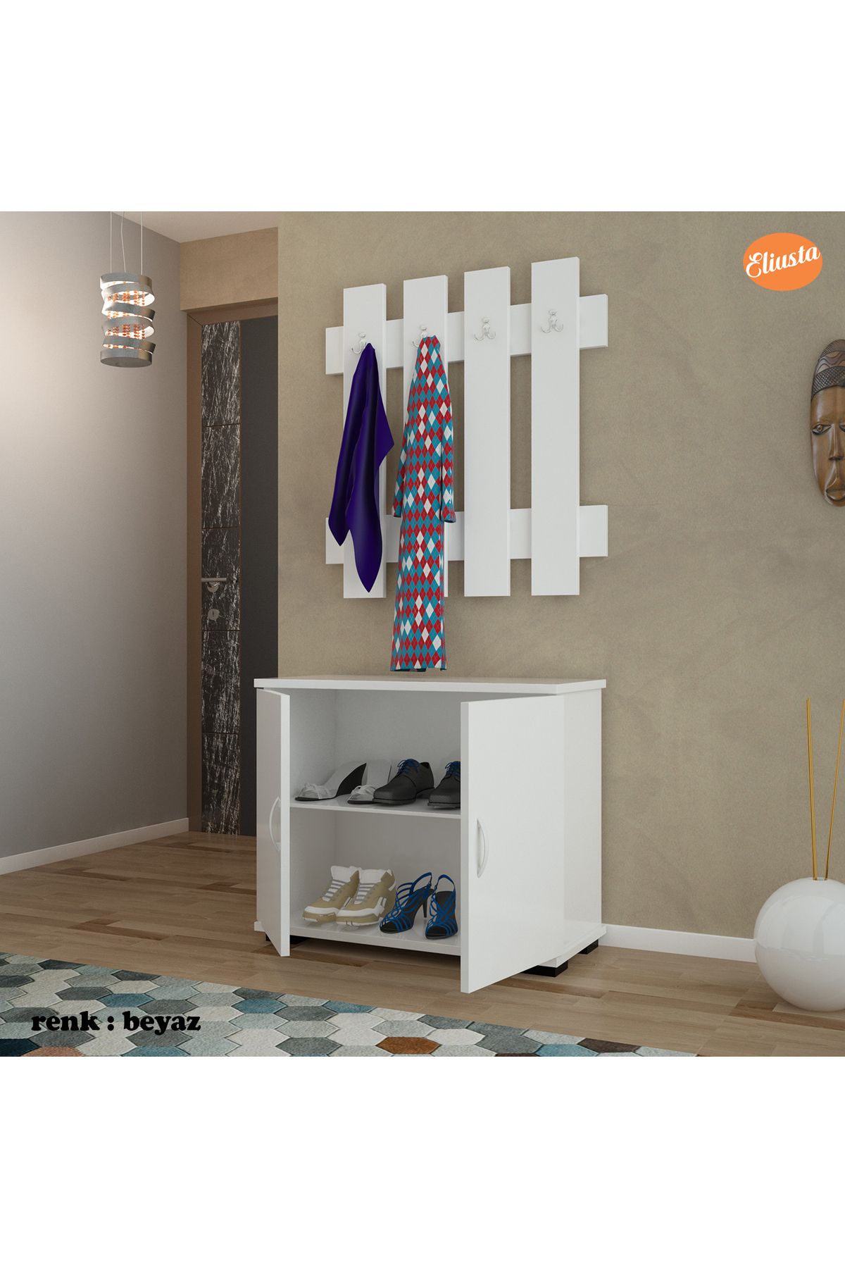 Dolap, iki kapak, 2 bölmeden oluşur. Geniş raf sayesinde 6 çift ayakkabı alır. Ergonomik kullanıma uygun ölçülerde tasarım. 8 Adet askılığı sayesinde ceket, mont vs. ortalıkta görünmesini istemediğiniz her şeyi tek bir yerde toplayabilirsiniz. Ürün resimlerindeki aksesuarlar teşhir amaçlı olup, fiyata dahil değildir.