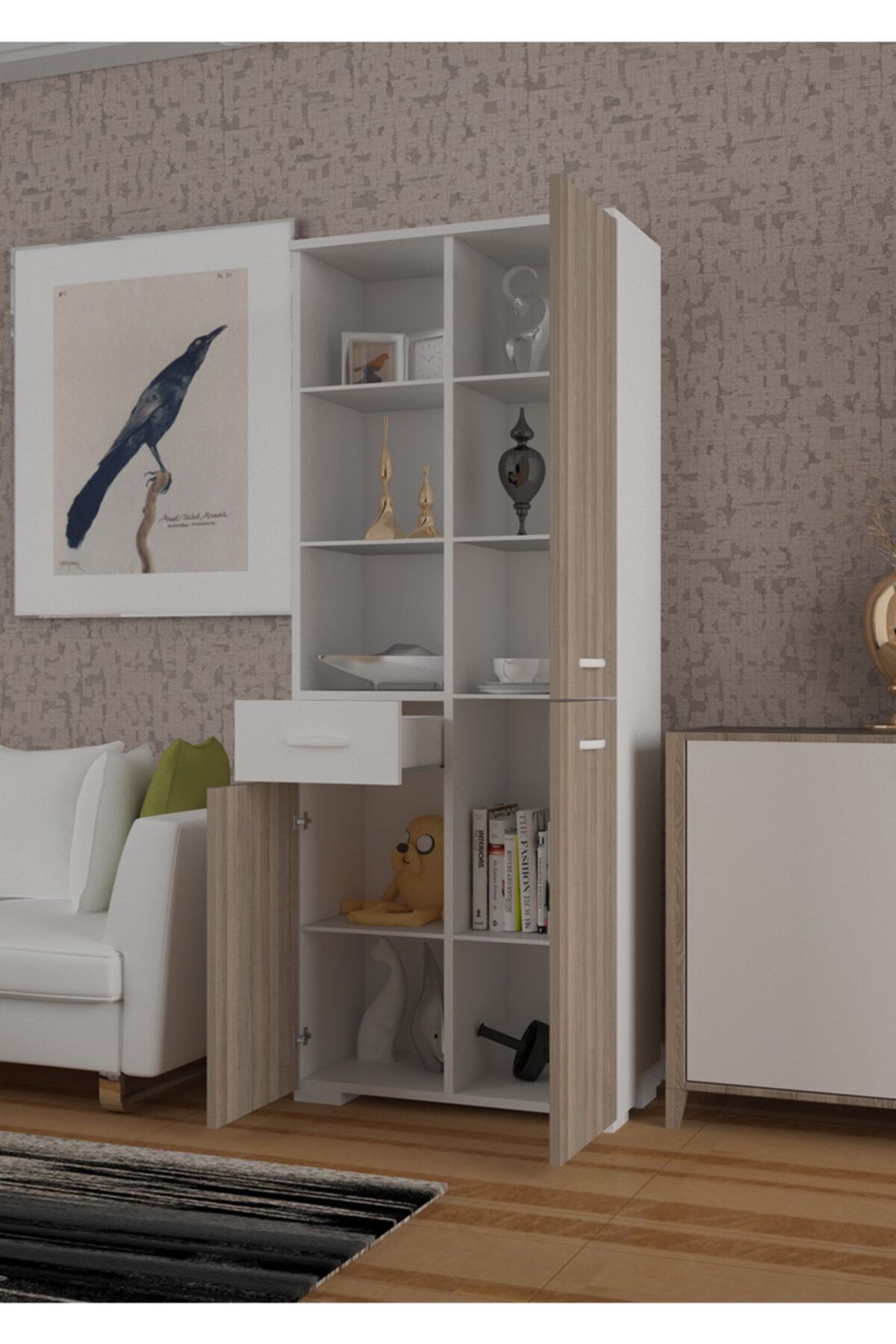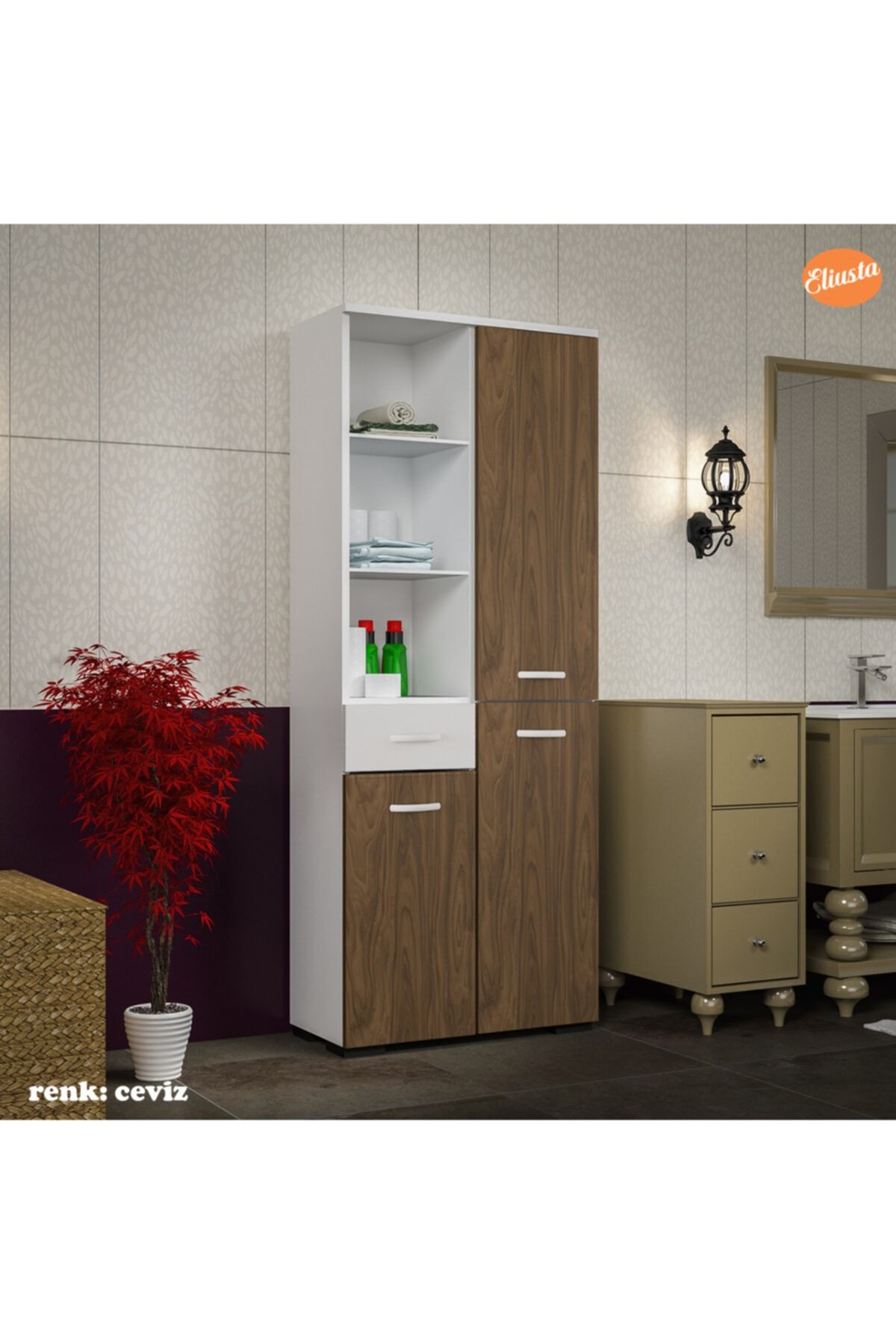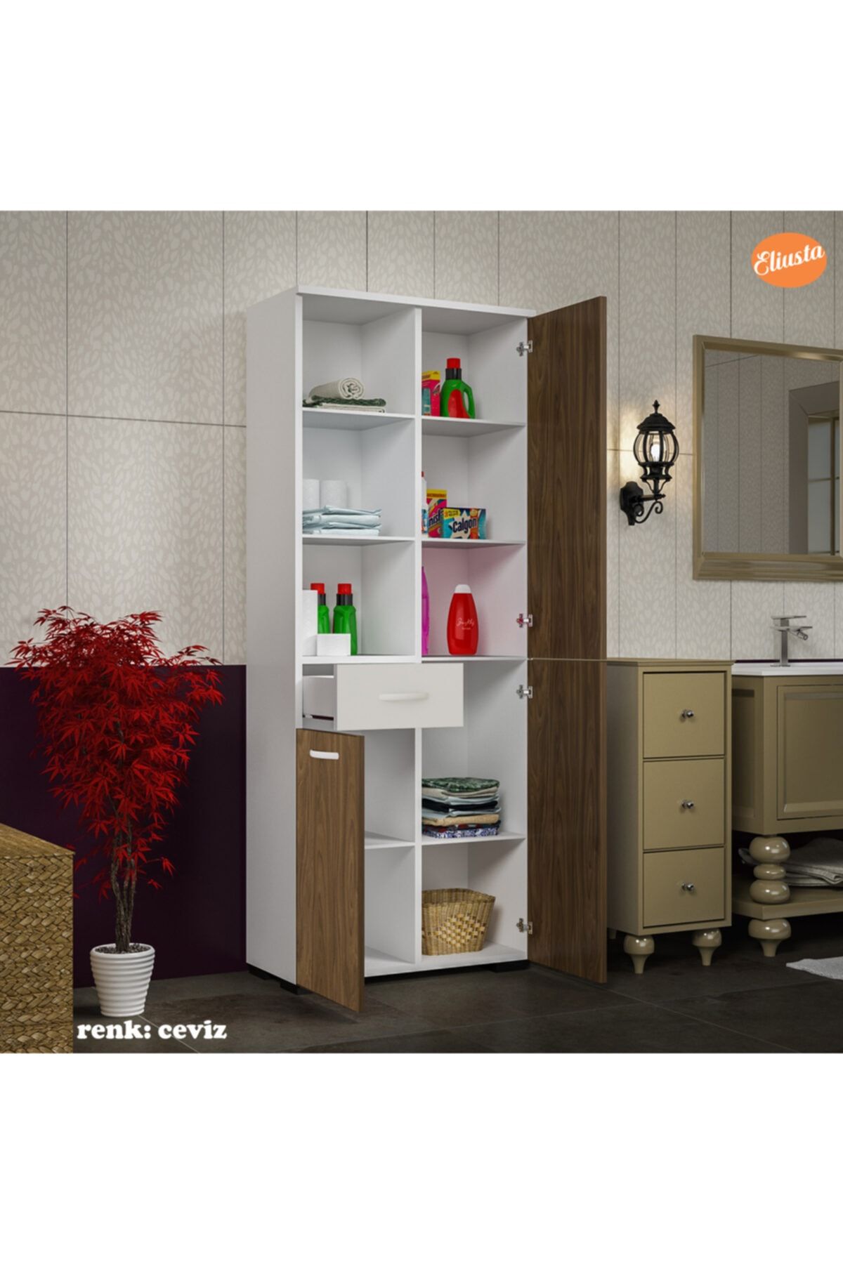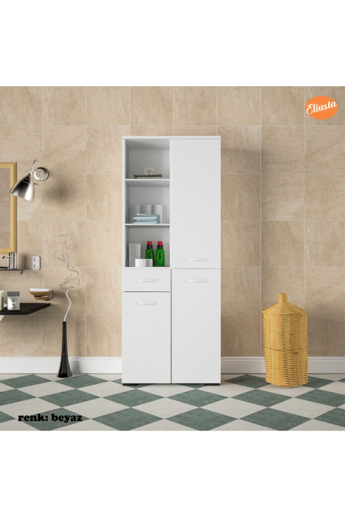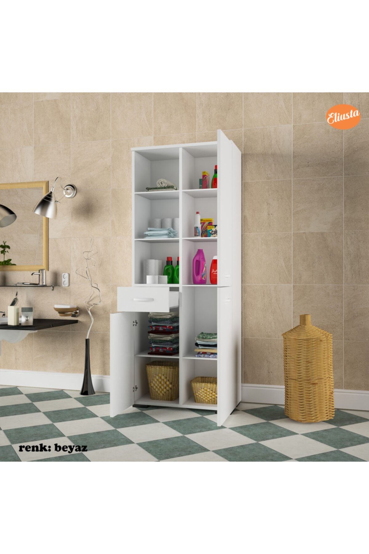 ÜRÜN ÖZELLİKLERİ EN (genişlik) : 55 cm ; BOY (yükseklik) : 165 cm ; DERİNLİK : 30,2 cm ; Dolap 3 kapak,Tek çekmece, 10 bölmeden oluşur. Ergonomik kullanıma uygun ölçülerde tasarım. Geniş raf sayesinde, ortalıkta görünmesini istemediğiniz temizlik ürünlerinizi, havlularınızı, takılarınızı, kitaplarınızı, biblolarınızı, daha birçok şeyi tek bir yerde toplayabilir, saklayabilirsiniz. Ürün resimlerindeki aksesuarlar teşhir amaçlı olup, fiyata dahil değildir. ÇOK AMAÇLI KULLANIM ALANI; Salon, Bebek odası, Genç odası, Banyo, Mutfak, Ofis, Balkon, Kiler, Antre kullanım alanlarıdır. Ürünlerimiz, Anti-Kanserojen E1 Sertifikalı, Avrupa standartlarında, kesinlikle sağlığa zararlı madde içermeyen, birinci sınıf, suya dayanıklı yüksek kalite melamin yüzeye sahip yonga levha kullanılarak üretilmiştir. ; GARANTİ SÜRESİ; Üretim ve işçilik hatalarına karşı 3 Yıl garantilidir. MONTAJ; Ürün kurulu olmadan (demonte olarak) kutulu halde teslim edilmektedir.Paket kolay ve eğlenceli kurulum için gerekli kurulum şeması,çıkmaktadır. Ek olarak sadece yıldız tornavida yeterlidir.Kutu içinde tüm parçalar kurulum için gerekli olan kurulum klavuzu malzeme torbası çıkmaktadır.