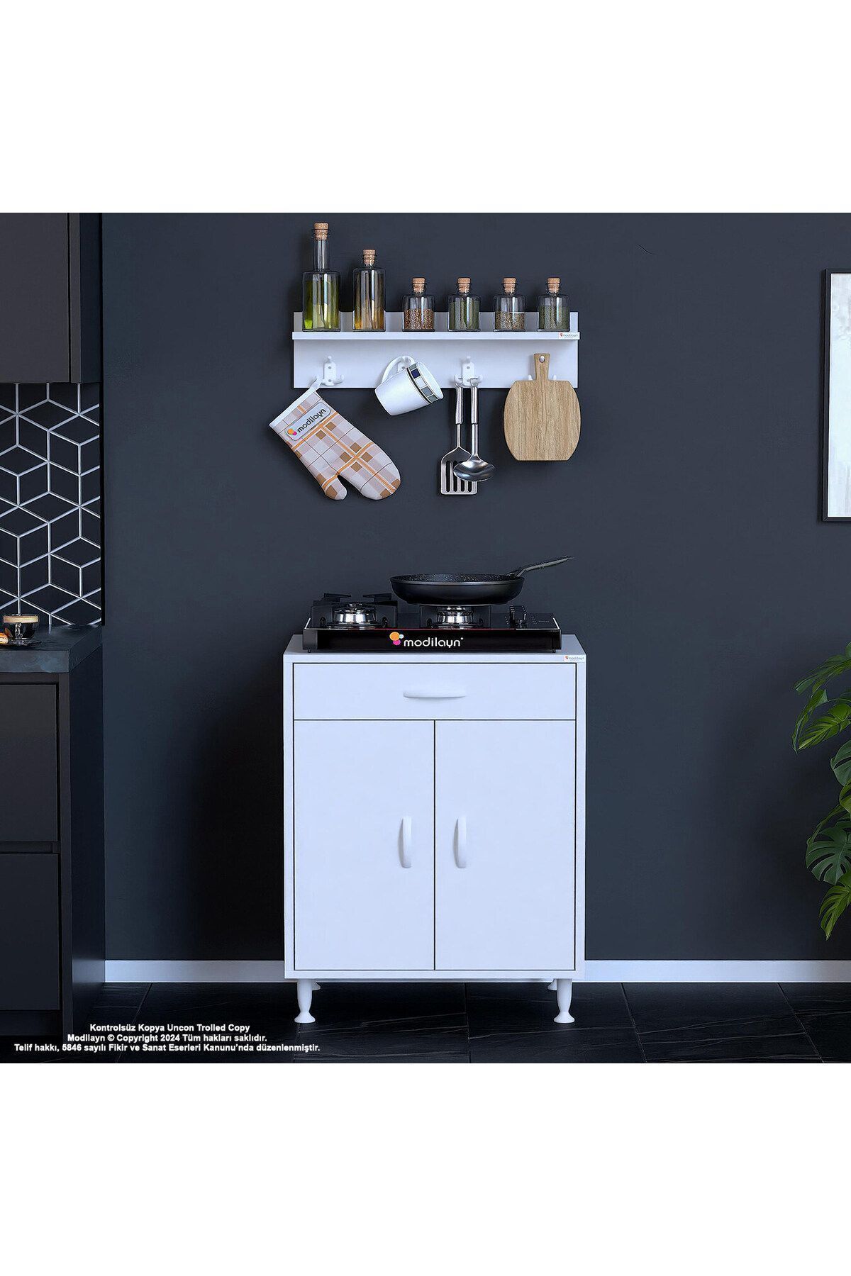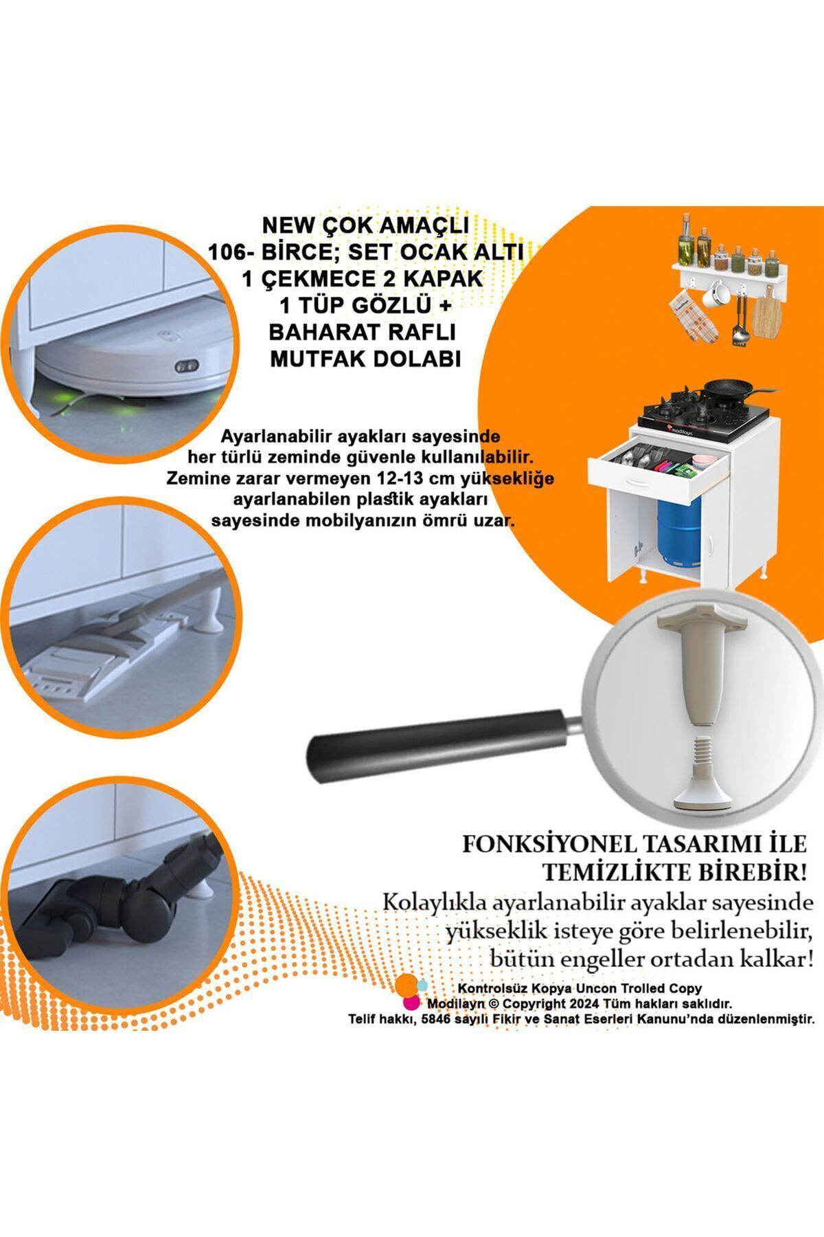 Dolap ölçüleri; En (genişlik) : 59 cm ; Boy (yükseklik) : 85,4 cm ; Derinlik : 50 cm ; Kapaklı kısmın iç yüksekiği 65 cm dir.; ; Çekmece içi derinlik 10,5 cm dir.; Çekmece dışı yükseklik 15 cm dir.; ; Çekmece iç ölçüsü 50*28,5 tir.; Yani genişlik 50 cm, arkaya doğru da 28,5 cm dir.; ; Setaltı dolap iki kapak tek çekmeceli iki bölmeden oluşur.; Ergonomik kullanıma uygun ölçülerde tasarlanmıştır.; Ortalıkta görünmesini istemediğiniz tüp, temizlik ürünlerinizi vs.; Her şeyi tek bir yerde toplayabilir, saklayabilirsiniz.; Ürün resimlerindeki aksesuarlar teşhir amaçlı olup, fiyata dahil değildir.; * çok amaçlı kullanım alanı ; Genç odası, mutfak, ofis balkon, kiler, antre * kullanılan malzeme ; 1. Kalite 18mm bt buz beyazı orma, kastamonu enteğre markalı yüksek kalite melamin yüzeye sahip yonga levha kullanılarak üretilmiştir.; E1 kalitesinde olup kanserojen madde içermez ve anti bakteriyeldir.; Yonga levha kenarbant pvs 0, 40 ve 1 mm kullanılmaktadır.; Iso 9001 ve tse belgesine sahiptir.; * kullanılan aksesuarlar ; Çevreye ve sağlığa zararsız kanserojen madde içermez.; Kulp, menteşe ve ayaklar uzun yıllar sorunsuz bir şekilde kullanabileceğiniz 1. Sınıfta,tse onaylıdır.; Menteşe ve raylar samet - Yeniler - Yeni nesil pls kulp, 10 cm ayaklar ve diğer aksesuarlar mesan marka kullanılmaktadır.; Kullanılan ham madde ve tüm montaj malzemeleri, %100 türk malı ıso 9001 ve tse belgesine sahiptir.; 1. Kalite olarak türkiye? De üretilmektedir.; ( satın alınan ürünle ekonomiye can verin ) Garanti süresi; Üretim ve işçilik hatalarına karşı 3 yıl garantilidir.; kargo teslimi; ürünleri teslim alırken koliyi kontrol ediniz, hasarlı koliyi lütfen teslim almayınız, teslim almadığınıza dair tutanak tutturunuz ve nedenini açıkça anlaşılır şekilde yazınız.; Hasarlı ürün; kurulumu yapılmamış parçalarda hasar oldugu zaman ürün parçası tespit edilip 1,2 gün içinde ücretsiz gönderim sağlanır.; Montaj; ürün kurulu olmadan (demonte olarak) kutulu halde teslim edilmektedir.; Paket kolay ve eğlenceli kurulum için gerekli kurulum şeması,çıkmaktadır.; Ek olarak sadece yıldız tornavida yeterlidir.; Kutu içinde tüm parçalar kurulum için gerekli olan kurulum klavuzu malzeme torbası çıkmaktadır.; Demonte olarak gönderilen mobilyalarda ürün kurulumu yapıldıktan sonra iadesi kabul edilmemektedir.; Herhangi bir sorunla karşılaşılırsa tarafımıza telefon ya da mesaj yolu ile ulaştığınızda sorunun çözümü için elimizden gelen yardımı esirgemeyeceğimiz konusunda kuşkunuz olmasın lütfen.