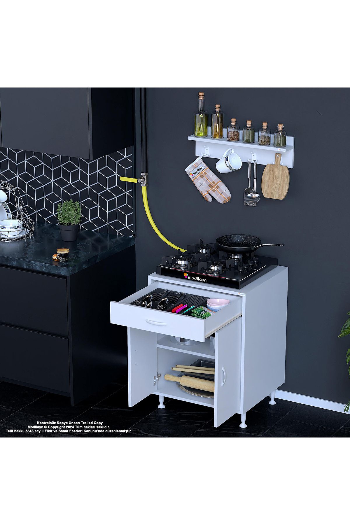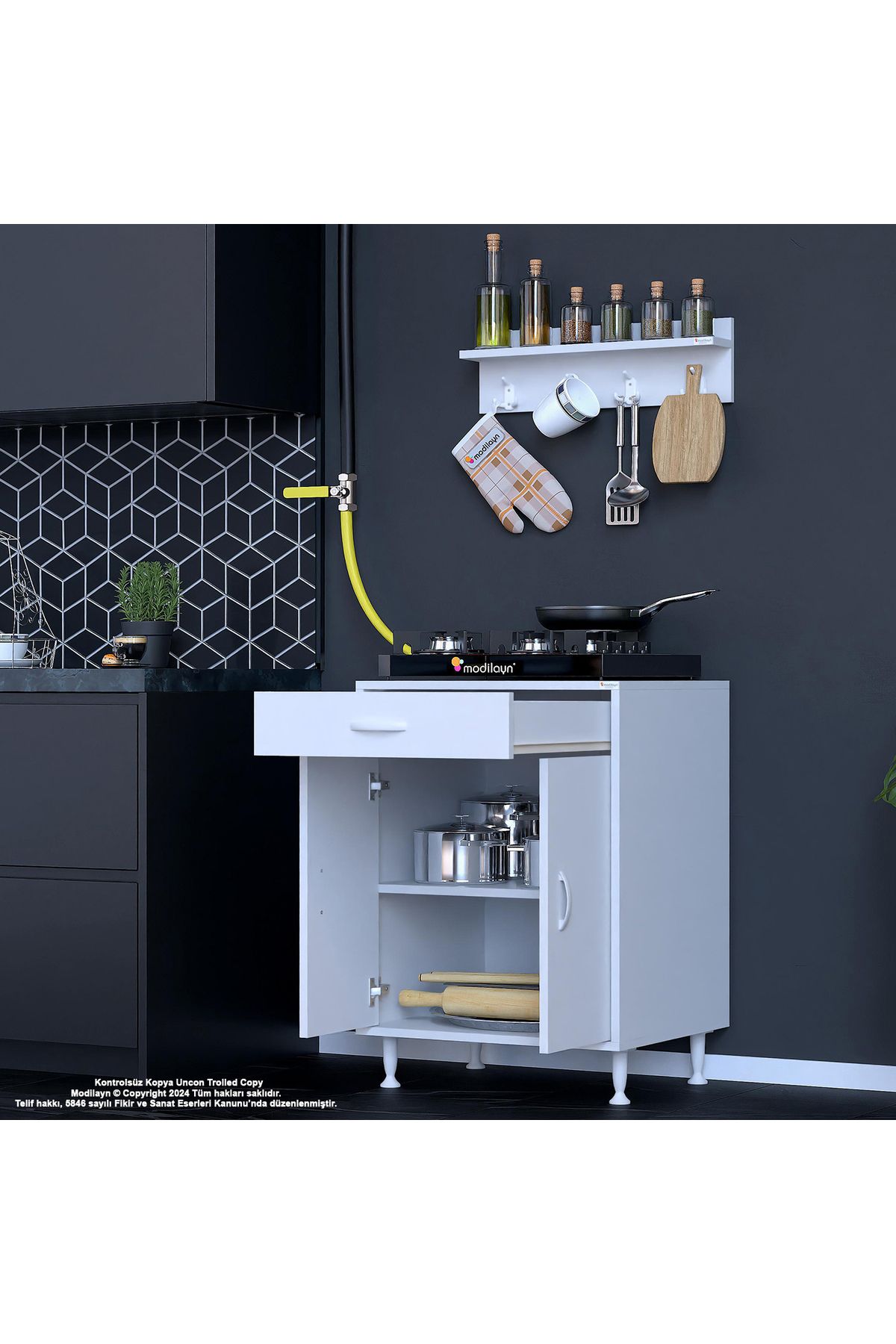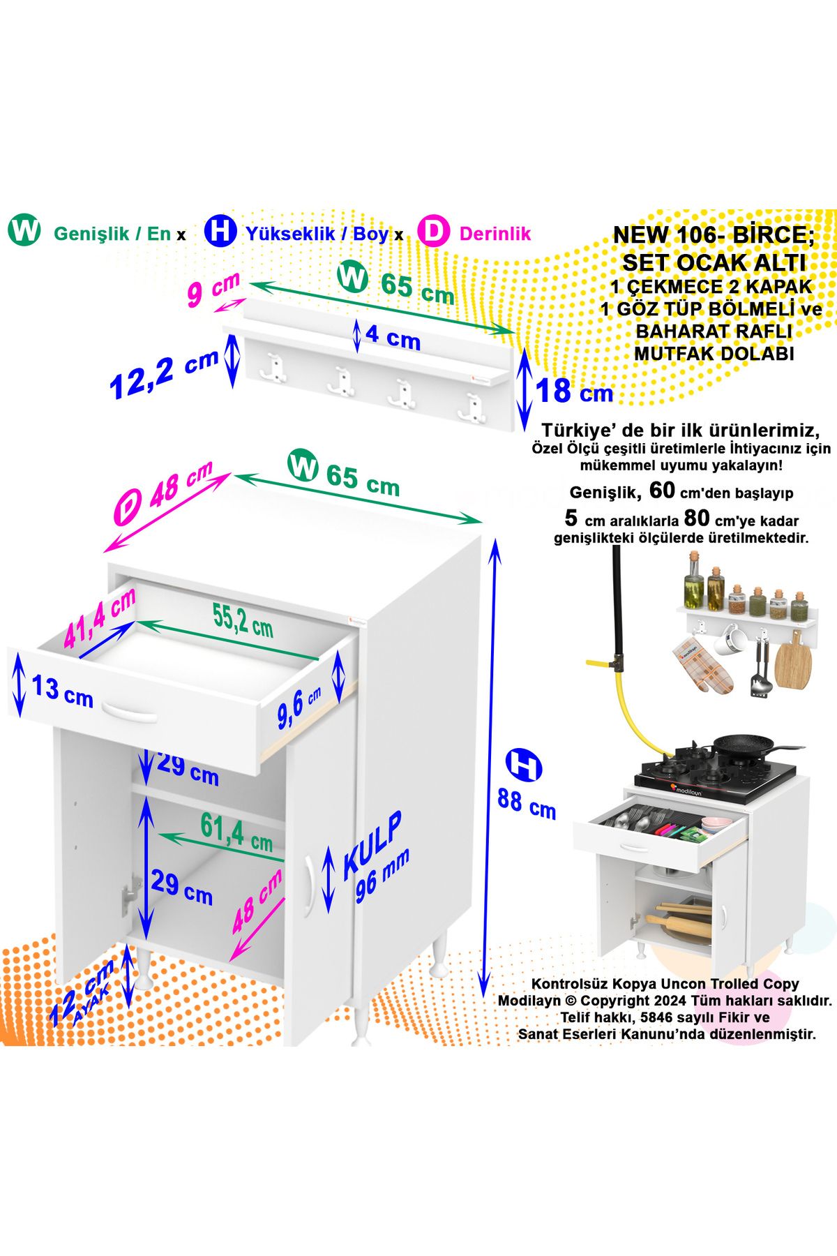 Modern tasarımıyla mutfak dekorasyonunuza şıklık katan birce l; 65 x 87 x 48 cm boyutlarında kapaklı set ocak altı dolap ve baharat rafı; Suntalam malzemesi sayesinde dayanıklı ve uzun ömürlü kullanım sunar; Boyuna modeli ile mutfakta yerden tasarruf etmenizi sağlar ve alanınızı daha verimli kullanmanızı mümkün kılar; 3 yıl garanti süresi ile satın alma sonrası güven verir ve müşteri memnuniyetini ön planda tutar;