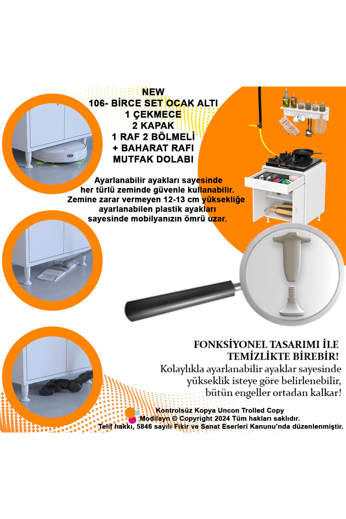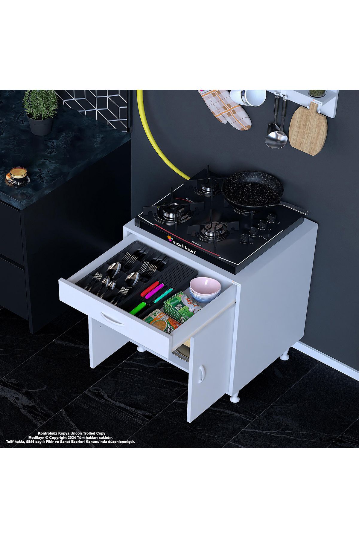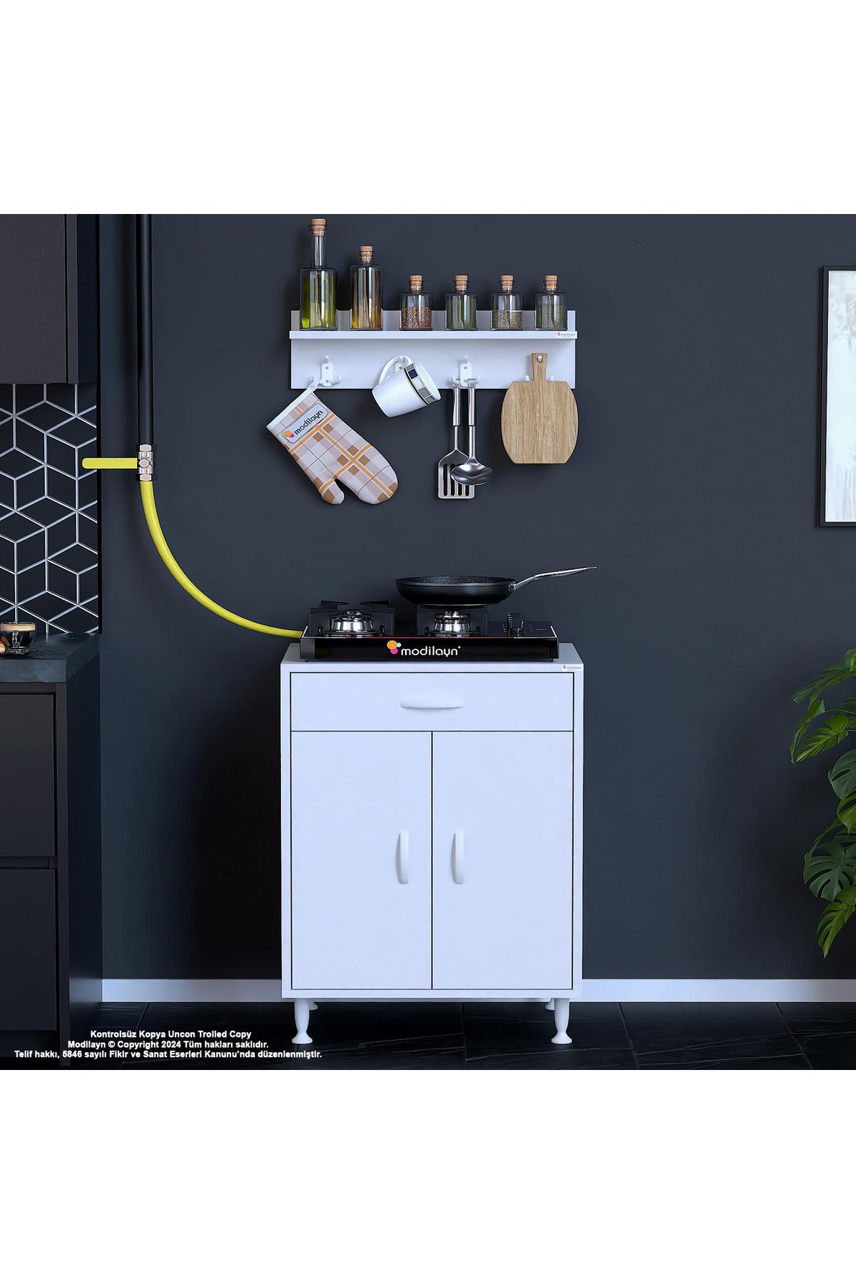 Modern tasarımıyla mutfak dekorasyonunuza şıklık katan birce l; 65 x 87 x 48 cm boyutlarında kapaklı set ocak altı dolap ve baharat rafı; Suntalam malzemesi sayesinde dayanıklı ve uzun ömürlü kullanım sunar; Boyuna modeli ile mutfakta yerden tasarruf etmenizi sağlar ve alanınızı daha verimli kullanmanızı mümkün kılar; 3 yıl garanti süresi ile satın alma sonrası güven verir ve müşteri memnuniyetini ön planda tutar;