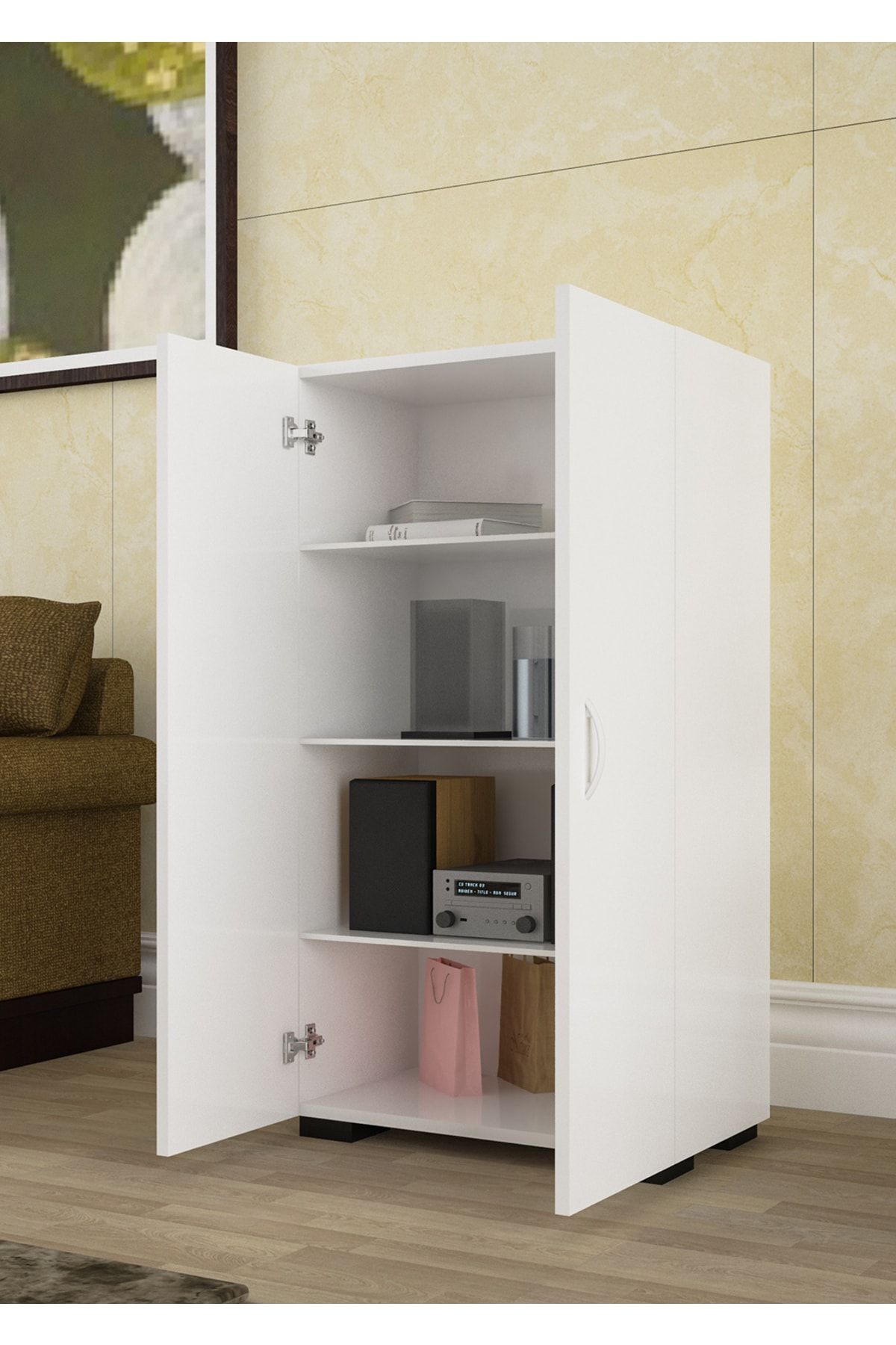 1.kalite 18 mm malzemeden imal edilen beyaz banyo dolabı banyo içerisinde kullanıma uygun su ve neme karşı dirençli yapısı sayesinde uzun ömürlü kullanım sunar.; Eşya organize etmeye yarayan banyo dolabı çok amaçlı kullanıma elverişlidir. Banyo, mutfak, antre ve yatak odalarında organizer dolap, erzaklık, gardırop ve çamaşır dolabı gibi çeşitli işlevler için kullanılabilir.; 54 cm en, 110 cm boy ve 32 cm derinliğe sahip olan 2 kapaklı banyo dolabı ideal ölçüleri ile alandan tasarruf sağlanmasına imkan verir.; 4 katlı banyo dolabı raflı tasarımı ve geniş iç kapasitesi sayesinde yeterli ölçüde eşya depolamaya ve fazla eşya kalabalığını ortadan kaldırmaya yardımcı olur.; Basit ve düz tasarımı ile evin her alanına rahatlıkla uyum sağlayan mini gardırop dekoratif görünümü sayesinde görüntü kirliliği yaratmaz, görünmesini istemediğiniz eşyaların saklanmasına olanak tanır.; Ergonomik kullanıma uygun tasarlanan organizer dolap kapak kulpları ile kullanım kolaylığı sağlar.; Melamin kaplama ile parlak bir görünüm elde eden çok amaçlı dolap hafif yapılı üretim malzemesi sayesinde kolay hareket ettirilir. Bir bezle kolaylıkla temizlenen model hijyenik kullanım sunar.; Kapaklı tasarımı sayesinde eşyaların toz, su ve nemden etkilenmesini engelleyen organizer banyo dolabı kapalı balkon ve bahçe gibi alanlarda kullanım için idealdir.;
