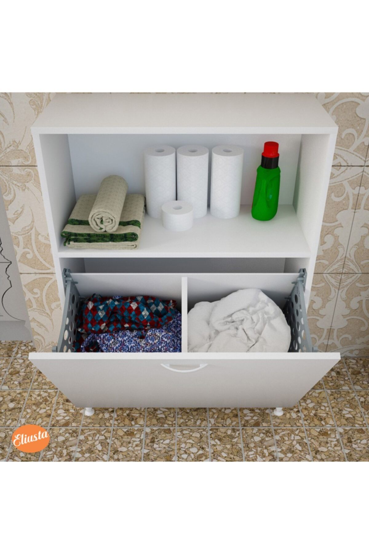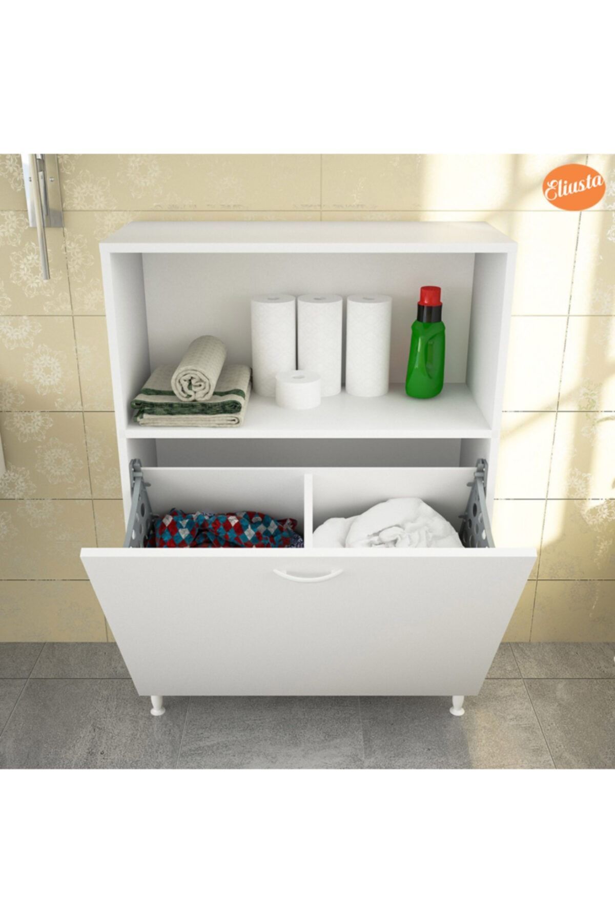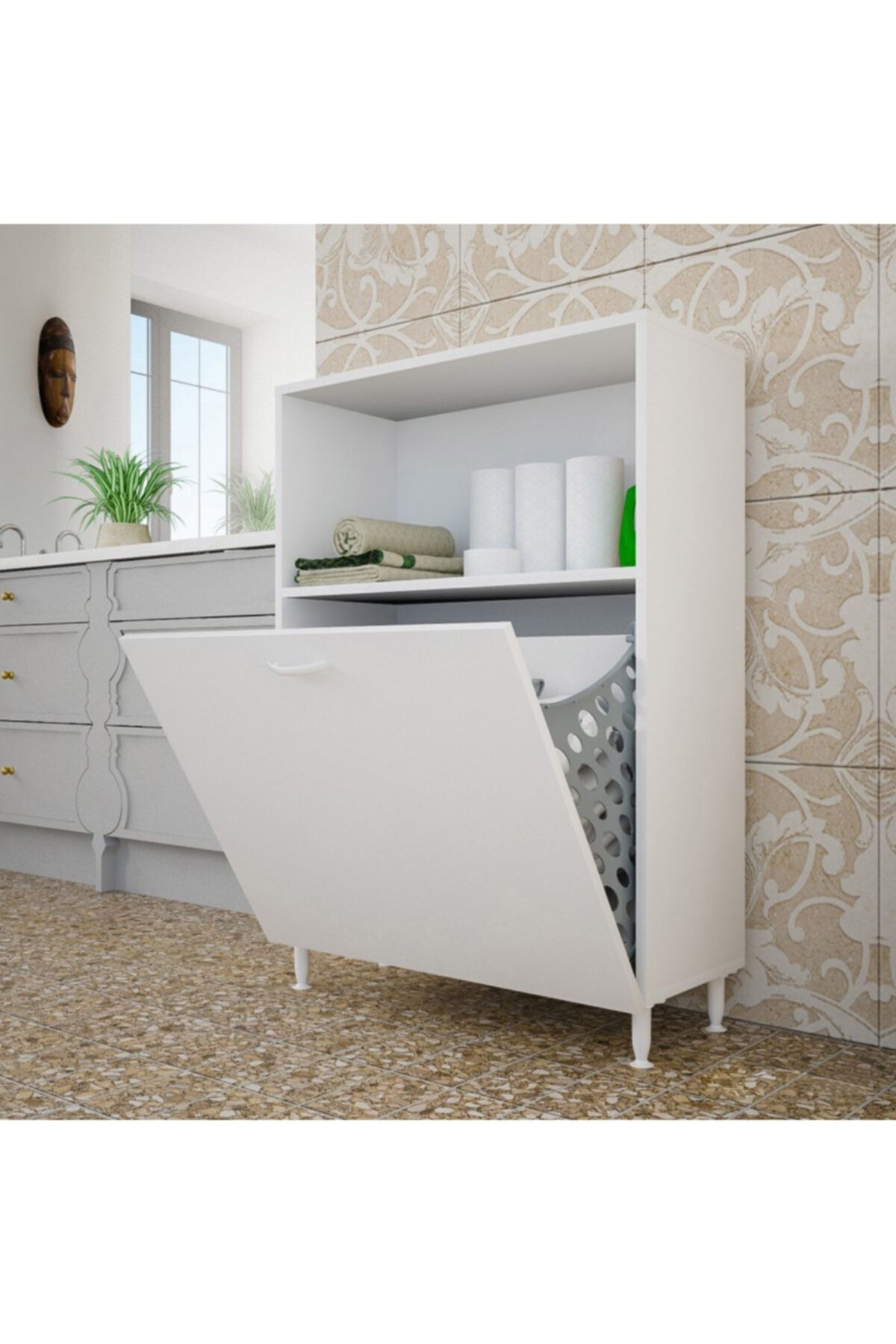 100 CM yükseklik, 30 CM derinlik, 75 CM genişlik ölçüleri ile tasarlanan ayaklı banyo dolabı banyolarda alt modül olarak kullanılmaya uygunluk gösterir.; Beyaz banyo dolabı 1 adet açık raf ile oldukça şık bir tasarıma sahiptir.; Alt kısmı ise; kirli sepeti olarak kullanılabilir.; Sepetli banyo dolabı kirli kıyafetlerinizin toparlanması için özel bir alan bulundurur.; Böylelikle kıyafetlerinizin kokmasının önüne geçilebilir ve daha düzenli bir görünüm oluşur.; Açık raflı banyo dolabı geniş raf ölçüsü sayesinde birçok eşyayı düzenli bir şekilde yerleştirmenizi sağlar.; Böylelikle banyonuzu konforlu bir şekilde kullanabilirsiniz.; Suntalam banyo dolabı suya ve neme karşı dayanıklı olduğu için kabarma ve şişme yapmadan kullanımı gerçekleştirilir.; Beyaz renk seçeneği sayesinde hoş bir görüntü ortaya çıkarır.; 2 önde, 2 arkada olmak üzere 4 adet ayaktan tasarlanır.; Ayakları dayanıklı materyalden üretildiği için, ağır eşyaların kolaylıkla taşınmasına olanak tanır.; Kirli sepeti bölümü yavaş açılıp kapanabildiğinden, yumuşak kullanıma uygun bir model olarak beğeni toplar.; Aynı zamanda kirli sepeti bölümünü açıp kapatabilmeniz için 1 adet kulp bulunur.; 1 adet paslanmaz kulptan oluştuğu için sağlıklı bir şekilde kullanabilirsiniz.; Aynı zamanda küflü, nemli ve rutubetli ortamlarda da sorunsuz kullanımı mümkün kılar.; Kenarları PVC kaplamaya sahip olduğu için keskinliği giderilir.; Böylelikle güvenilir bir şekilde kullanım imkanı sunar.;